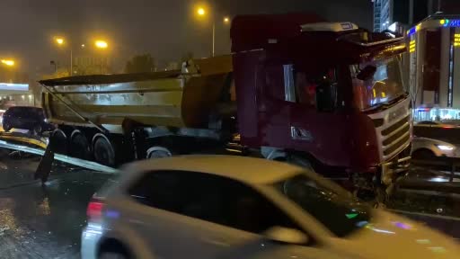 Ataşehir’de kayganlaşan yolda kontrolden çıkan hafriyat kamyonu bariyerlere ...