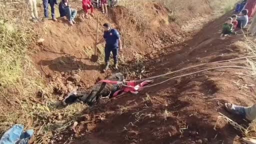 Tahliye kanalına düşen inek kurtarıldı